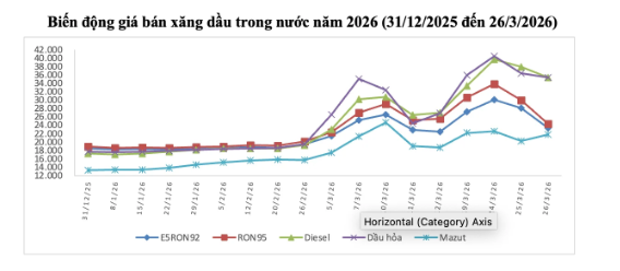 Giá thành phẩm xăng dầu thế giới giữa kỳ điều hành giá ngày 26/3/2026 và kỳ điều hành ngày 25/3/2026 là: 131,050 USD/thùng xăng RON92 dùng để pha chế xăng E5RON92 (giảm 10,760 USD/thùng, tương đương giảm 7,59%); 135,600 USD/thùng xăng RON95 (giảm 10,760 USD/thùng, tương đương giảm 7,35%); 182,190 USD/thùng dầu hỏa (giảm 22,450 USD/thùng, tương đương giảm 10,97%); 204,620 USD/thùng dầu diesel 0,05S (giảm 14,310 USD/thùng, tương đương giảm 6,54%); 637,830 USD/tấn dầu mazut 180CST 3,5S (giảm 52,130 USD/tấn, tương đương giảm 7,56%).