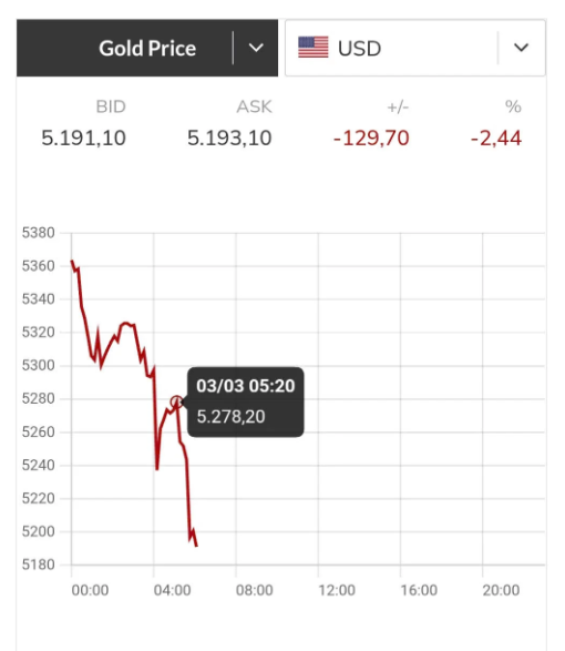 Mở cửa phiên giao dịch Mỹ ngày 3/3 (giờ Việt Nam), vàng giao ngay thậm chí đã mất mốc 5.200 USD/ounce.