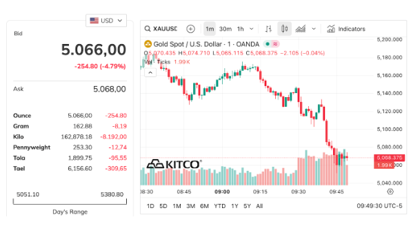 Vào 21h57 (giờ Việt Nam), giá vàng lại rơi tự do xuống 5.035 USD/ounce rồi nhanh chóng bật lên mức 5.050 USD/ounce (tương ứng giảm 5%).