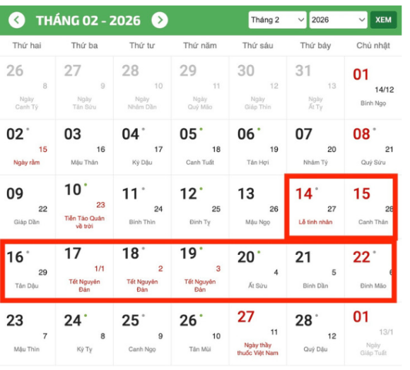 Thời gian nghỉ Tết Nguyên đán 2026 cụ thể