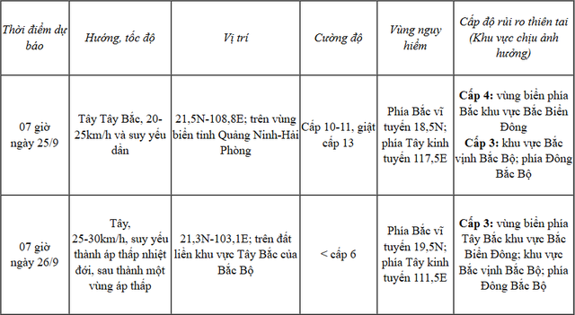 Trên đất liền: Từ gần sáng 25/9, ven biển Quảng Ninh–Ninh Bình gió mạnh dần lên cấp 6–7, vùng gần tâm bão cấp 8–9, giật cấp 11; sâu trong đất liền phía Đông Bắc Bộ gió mạnh cấp 5, có nơi cấp 6, giật cấp 7–8.
