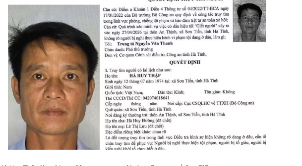 Theo đó, tại Quyết định truy tìm số 2310/QĐ-CSHS ngày 27/4/2026, Hà Huy Thập được xác định là người có liên quan đến vụ án, hiện không rõ đang ở đâu.