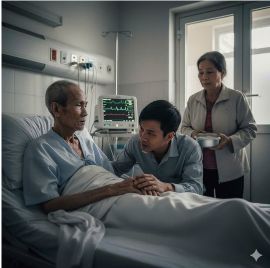 Phòng bệnh khi ấy chỉ có tiếng máy tim đếm từng nhịp yếu ớt, mùi thuốc sát trùng hăng nồng. Ông nằm trên giường, gầy đến mức tôi có thể thấy rõ từng khớp xương trên bàn tay nắm lấy tay tôi.