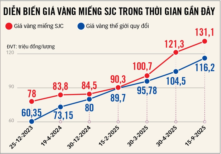 Diễn biến giá vàng miếng SJC tăng nóng thời gian gần đây – Dữ liệu: ÁNH HỒNG – Đồ hoạ: TẤN ĐẠT